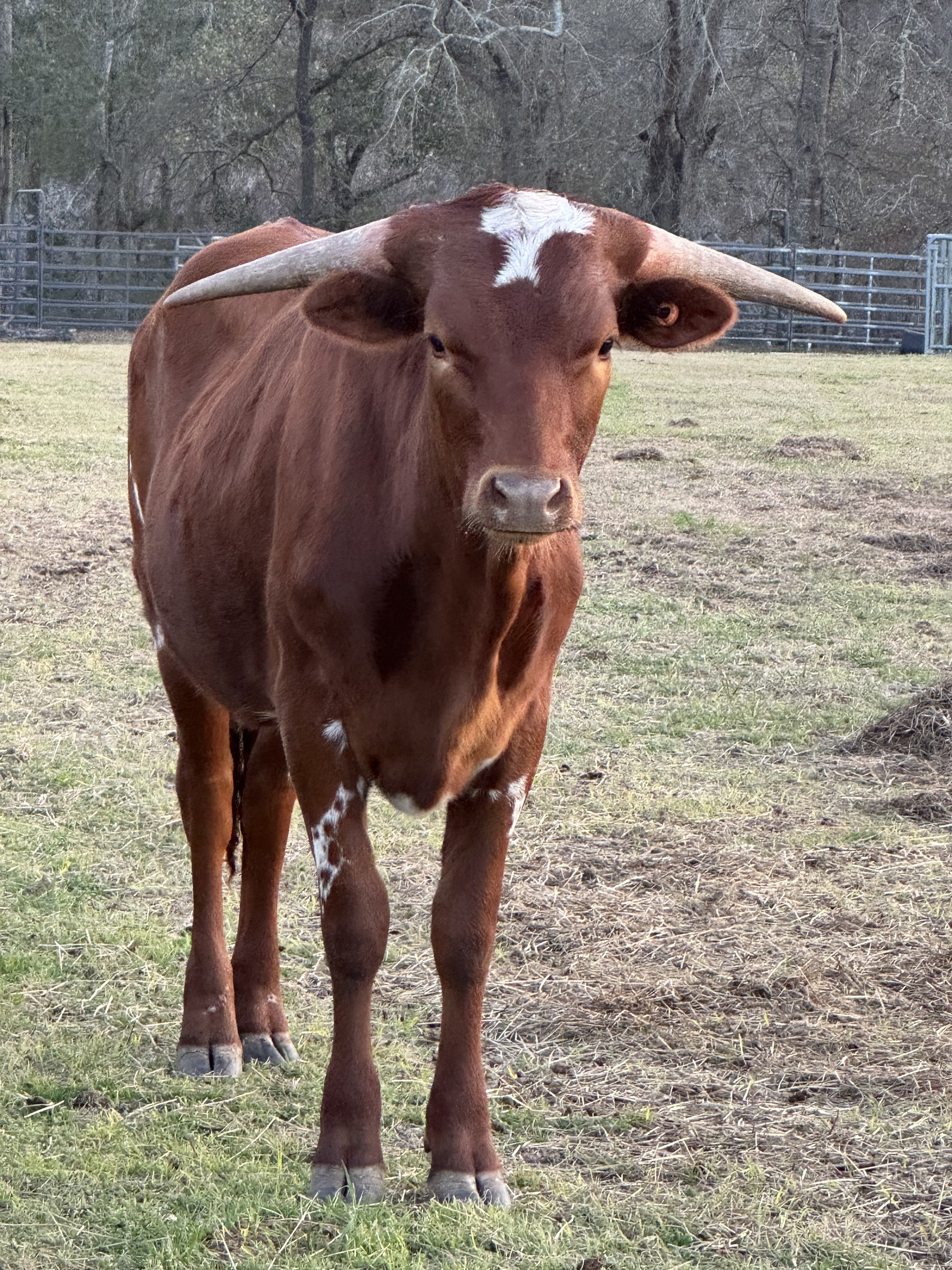 This young lady is a beautiful deep Merlot color with horns that are rolling back. She is easy to work and handle.