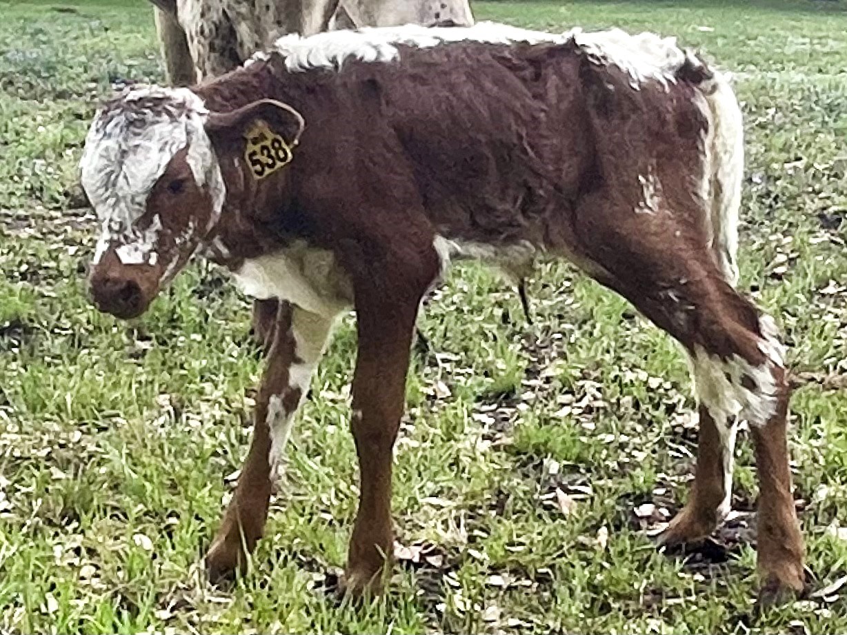 White lacey face, red body with white topline, white underline, white tail, and white roan on thighs
