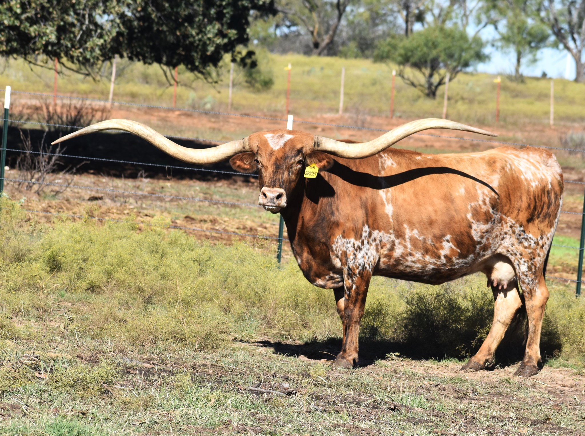 Beautiful brindle and white paint with fantastic twisting horns that are over 103" tip to tip. To sweeten this deal, she is also sired by Drag Iron. Bred to Cut'N Dried.