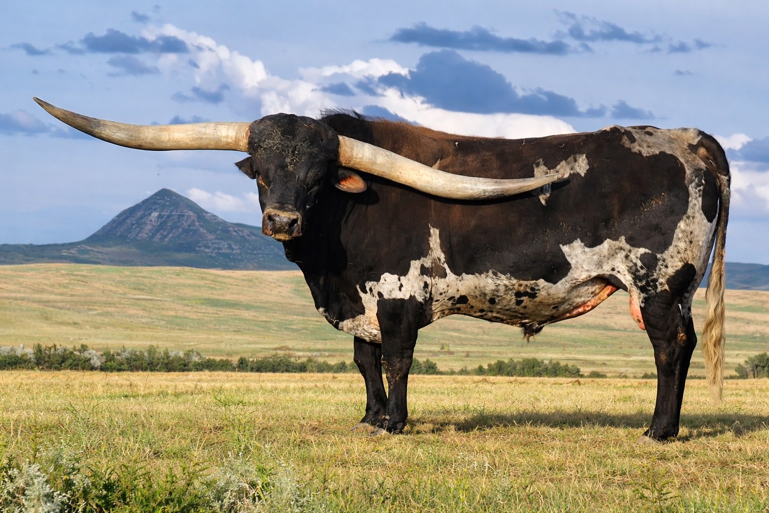 DEL CHARRO was a Game Changer! Unfortunately, he died on March 10, 2025 Early horn growth is an important mile marker. Del Charro is in the TOP TEN (#9) in the entire breed for earliest to reach 70" tip to tip. He passed 70" at 649 days. His last measurement put him at 92" tip to tip. He has a proven record of producing Color, Horn & Conformation. We think he is one of the most powerful and colorful sons of World Record horn champ, Cowboy Tuff Chex. We have a few (ONLY a few) straws of semen available $200.00 When these are gone there will not be any more. 605-381-3938